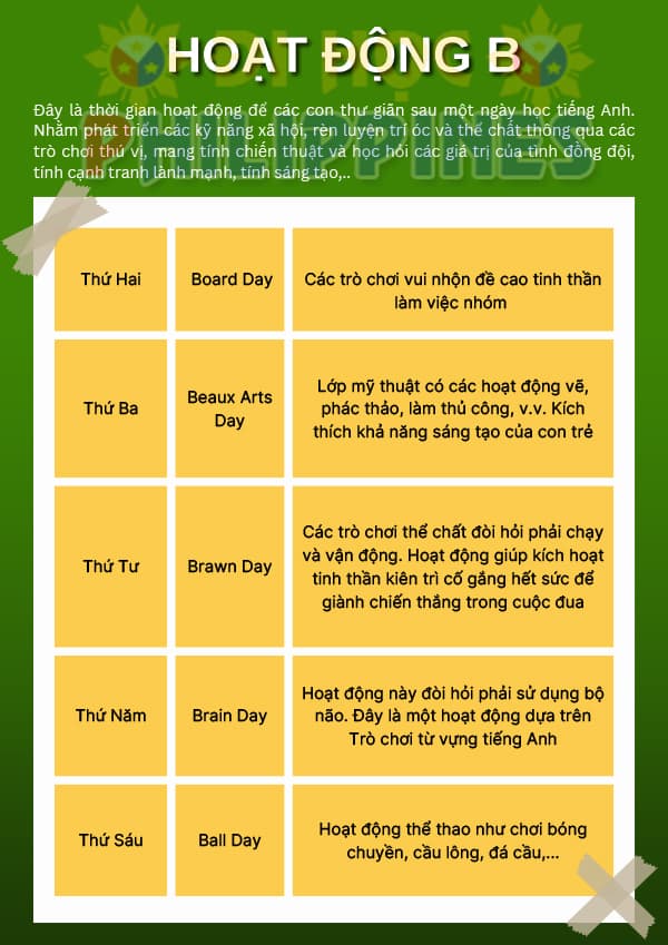 - Sport Activity: Chuỗi hoạt động thể chất với các trò chơi vận động đơn lẻ và theo nhóm, giúp các con có thời gian vui chơi với nhau và nâng cao tin thần thể dục thể thao, nâng cao sức khỏe.