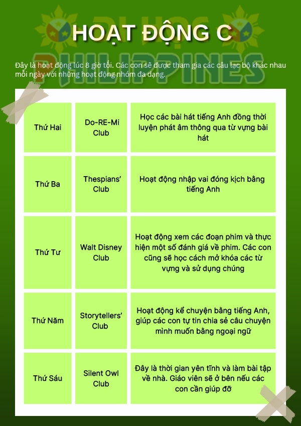 - Trại hè kết hợp chương trình học với các hoạt động thư giãn, ngoại khoá ý nghĩa. Học viên sẽ được khám phá đất nước Philippines xinh đẹp cùng nhiều trải nghiệm thú vị tại trại hè BECI.