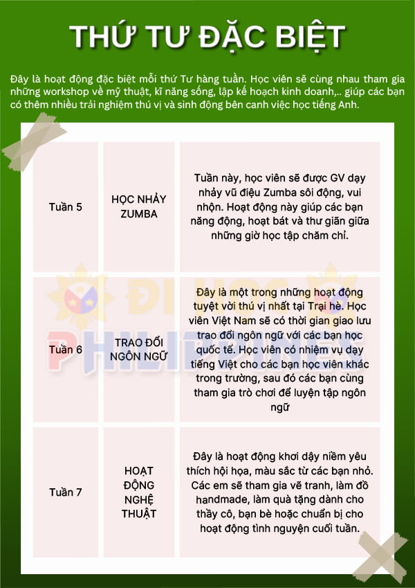 - Thời gian tổ chức trại hè dự kiến từ 1/6/2024 – 27/7/2024. Học sinh có thể tham gia khóa học từ 4-8 tuần.