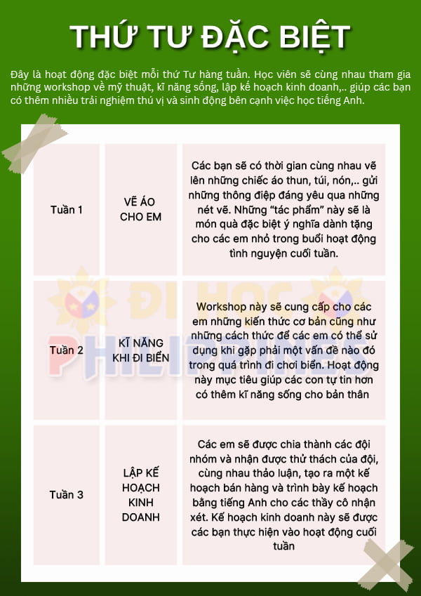 Tham gia chương trình trại hè Beci, học viên sẽ có 10 lớp học mỗi ngày từ thứ 2 đến thứ 6. Vào thứ 7 các bạn học viên sẽ có bài kiểm tra cuối tuần. Thông qua đó giáo viên sẽ biết được học sinh cần chỉnh sửa ở những điểm nào, giúp từng học viên cải thiện tiếng Anh một cách hiệu quả nhất. Chi tiết lịch trình của trại hè như sau: